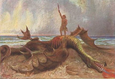 erstechen. Mit letzter Kraft versuchte Fafnir Siegfried zu töten, doch stattdessen viel er den Drachenfels hinunter und starb am Ufer des Rheins.